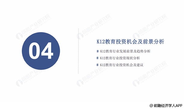 报告第四章节“K12教育投资机会及前景分析”,通过对K12教育行业发展前景及趋势与投资现状的分析,对2019年K12教育行业投资机会做了前瞻性预测与建议。