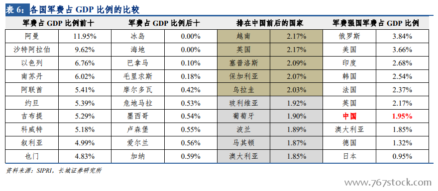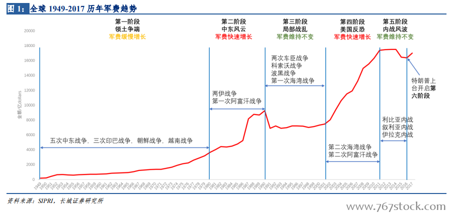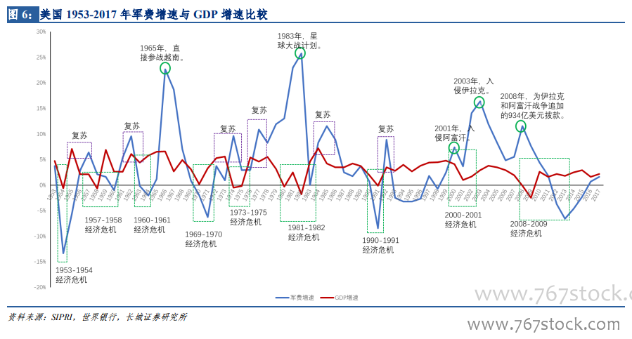从全球军费增长率与全球 GDP 增长率来看,世界军费的增长走势从 1970 年到 2017 年,几乎是与世界经济走势完全相同的,且有一定的滞后性。因此从长周期来看,军费增长没有表现出明显的逆周期性,其走势与世界经济的发展相同,但有 1-2 年的滞后性。