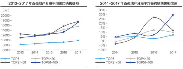 平均销售价格的分层数据显示,2013年到2017年,TOP3企业的平均签约销售价格仅为9863元,大幅低于其他层级企业的平均签约销售价格,其它层级之间分化并不明显。在平均销售价格增速方面,TOP21-50的销售价格增长率出现显著跌落,与该层级企业布局三四线城市有一定关联;同时,TOP51-100 企业平均销售价格增速达29.4%,TOP3、TOP4-20企业的平均销售价格增速起降不大,分别为6.7%和9.6%。