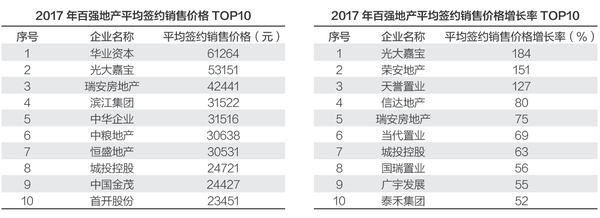 从平均销售价格的典型企业来看,2017年,华业资本的平均签约销售价格为61264元,居TOP100房企之首,除华业资本之外,光大嘉宝(53151元)、瑞安房地产(42441元)的平均签约销售价格也均突破4万元。从价格增速来看,2017年100强地产销售价格的增长率TOP10榜单中,TOP10的增长率均超过50%,而光大嘉宝、荣安地产、天誉置业则大幅增长,增长率均超过100%,其中光大嘉宝涨幅达到184%,居首位。