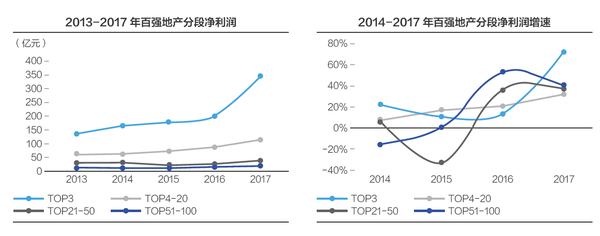 从净利润分层数据来看,2017年百强房企各层级的净利润均不同程度增长,其中TOP3的增速最快,由2016年的199亿元上升到2017年的343亿元,增速达73%,并且远高于2016年以前年份的增速;TOP4-20、TOP21-50、TOP51-100 的增速均在30%-40%之间,较为平稳,龙头企业的净利润水平与其他层级房企间分化明显。