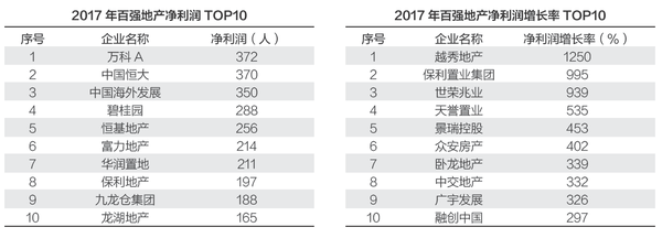 从净利润的典型企业来看,2017年,万科以372亿元领跑净利润百强排行榜,相对2016年第一名中海338亿元净利润提升约10%。恒大、中海分别以370亿元及350亿元占据第二、三名,并大幅领先第四名碧桂园(288亿元)。具体来看,值得注意的是,虽然恒大的净利润略低于万科,但根据恒大年报,2017年恒大因一次性卖出万科股票亏损70亿元。剔除此项非经常性损益因素之后,恒大的实际净利润已经超过万科。净利润增长率TOP10企业中,行业黑马异军突起,超过2成的百强房企利润增长超过100%,其中,越秀地产利润增长率达1250%、保利置业达995%、世荣兆业达939%,利润增长极具优势。值得注意的是,净利润增长率并不与营业收入增长率成正比,营业外收益、投资收益以及投资物业的公允价值收益等对房企净利润增长的影响较大。融创、碧桂园、恒大等企业由于销售额等业绩的大幅提升,净利润增长率也十分亮眼,分别达到了297%、204%、110%。