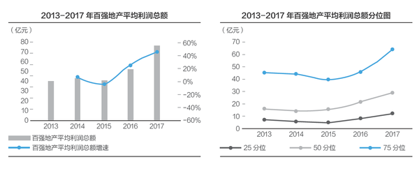 2017年,百强房企平均利润总额达76亿元,延续了2016年的增长趋势,增速达46%。从百强房企利润总额分位图看,2017年75分位、50分位、25分位均表现出稳健的增长趋势,增速分别达43%、36%、44%,但2017年三个分位的利润总额均低于百强地产的行业平均水平。