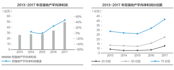 2017年,百强房企净利润平稳增加,从净利润规模看,2017年延续了2016年的增长趋势,平均净利润约49亿元,2017年增速(45%)对比2016年(25%),大幅上涨。