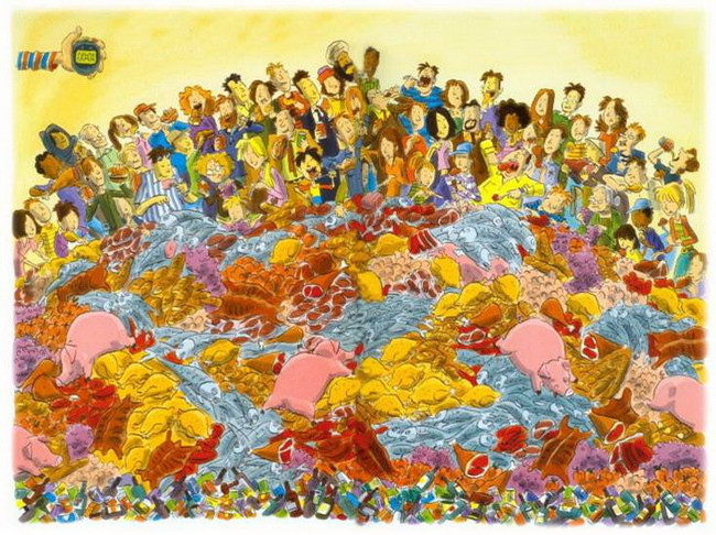 12頭牛、47隻豬、66頭羊、1850條海水魚、3600隻雞、13581個麵包、16717顆蘋果、34455顆莆萄和41814顆雞蛋。