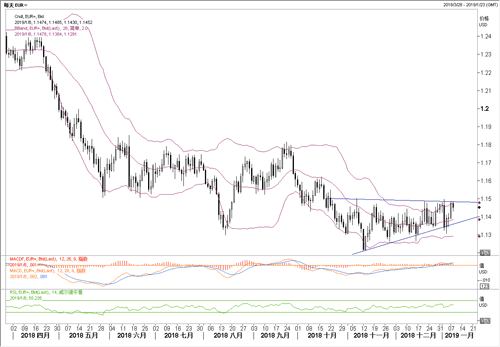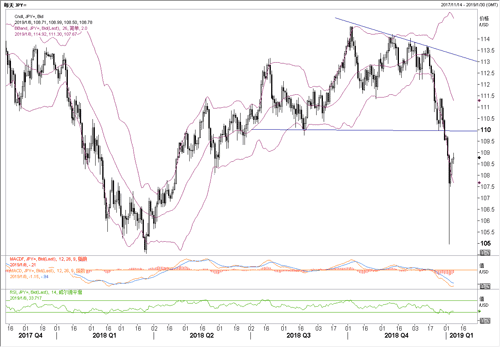 美元/日元自1月2日闪崩后出现回调,已连涨两天,避险情绪有所消退。在美联储2019年加息频率下降的大环境下,日元颇受投资者青睐,但美/日跌幅过快,从技术上看,需要回踩再下跌才能确认趋势,日线图出现一条超长下影线后反弹,暂时看仍有反弹空间,激进者可轻仓介入多单,目标109.5,止损108。
