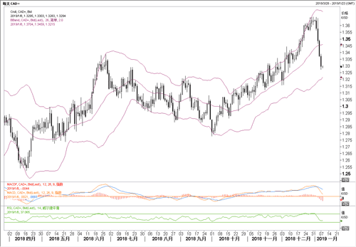 最近原油有抬头迹象,去年底OPEC达成的减产协议,各成员国逐渐兑现承诺,产油大国沙特也走出沙特记者大使馆暗杀案阴影,回归油价上涨引领者本色,甚至声称减产超出协议水平。美油重返50关口是大概率事件,因此加币短期逐渐变强势。技术图上,美/加连跌四天,正测试60日均线支撑力度。MACD绿色动能柱扩张且双线向下,RSI走低,操作上昨天建议的空单已到达盈利点,未离场的依然可以稳拿空单,止损上移至入场位确保盈利。