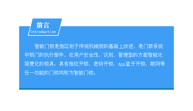 智能门锁是指区别于传统机械锁的基础上改进,是门禁系统中锁门的执行部件,在用户安全性、识别、管理型的方面智能化简便化的锁具。具有指纹开锁、密码开锁、App蓝牙开锁、联网等任一功能的门锁均称为智能门锁。