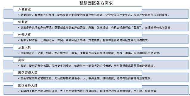智慧园区涉众通常包含园区管理人员、园区服务人员、入驻企业、创业者、从业人员、商家、外部访客7类角色。