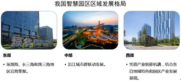 来源:前瞻产业研究院整理从空间维度来看,目前我国已经形成“东部沿海集聚、中部沿江联动、西部特色发展”的智慧园区空间格局。环渤海、长三角和珠三角地区以其大量的园区平台作为基础,成为全国智慧园区建设的三大聚集区;中部沿江地区借助沿江城市群的联动发展势头,大力开展智慧园区建设;广大西部地区凭借产业转移机遇,结合各自地域特色和园区产业发展基础,正加紧布局智慧园区建设工程。在接下来的3-5年内,中国中西部地区智慧园区建设或将来迎来全新的建设浪潮。