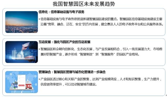 一方面,智慧园区将会朝向创新化、生态化发展。未来智慧园区建设将会更加注重高新技术、生态环保型等产业的发展,融入低碳管理理念将新的技术、管理手段、管理平台与园区的创新结合在一起。另一方面,智慧园区建设与园区产业发展相结合。引入一批发展潜力大、市场前景好的智慧产业,逐步形成“智慧制造”到“智慧服务”一条龙园区产业格局。