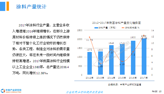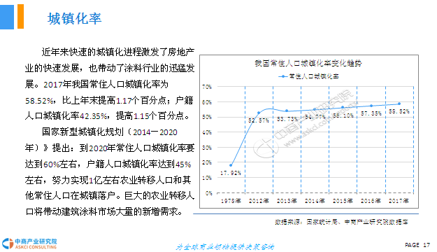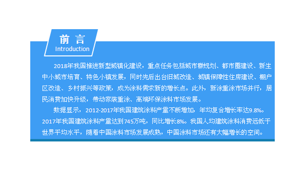 2018年我国推进新型城镇化建设,重点任务包括城市群规划、都市圈建设、新生中小城市培育、特色小镇发展,同时先后出台旧城改造、城镇保障性住房建设、棚户区改造、乡村振兴等政策,成为涂料需求新的增长点。此外,新涂重涂市场并行,居民消费加快升级,带动家装重涂、高端环保涂料市场发展。