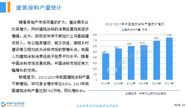 数据显示,2012-2017年我国建筑涂料产量不断增加,年均复合增长率达9.8%。2017年我国建筑涂料产量达到745万吨,同比增长8%。我国人均建筑涂料消费远低于世界平均水平,随着中国涂料市场发展成熟,中国涂料市场还有大幅增长的空间。
