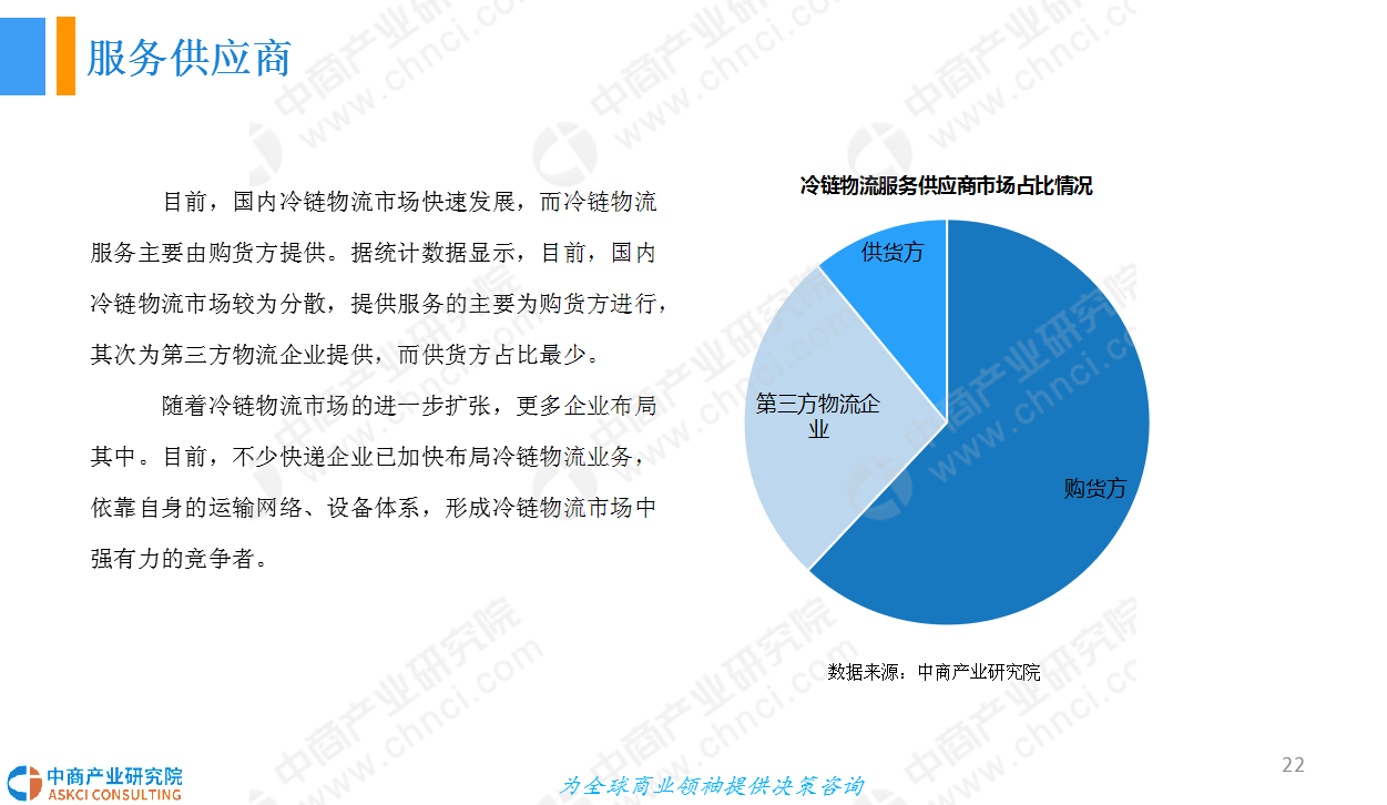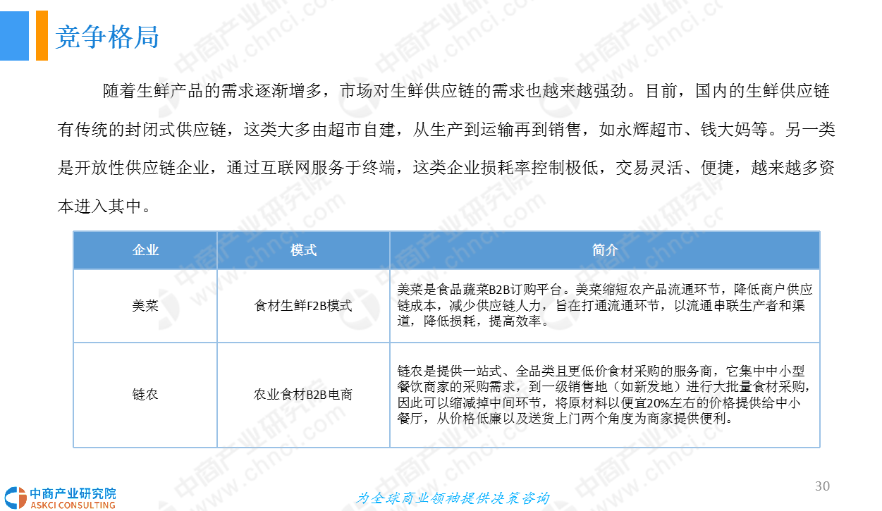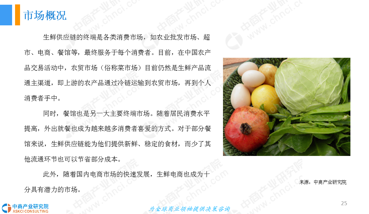 随着生鲜产品的需求逐渐增多,市场对生鲜供应链的需求也越来越强劲。本报告从生鲜供应链行业概况;供应链上中下游,即农业、冷链物流、终端消费市场;行业格局;市场前景四个方面进行分析行业的发展前景。