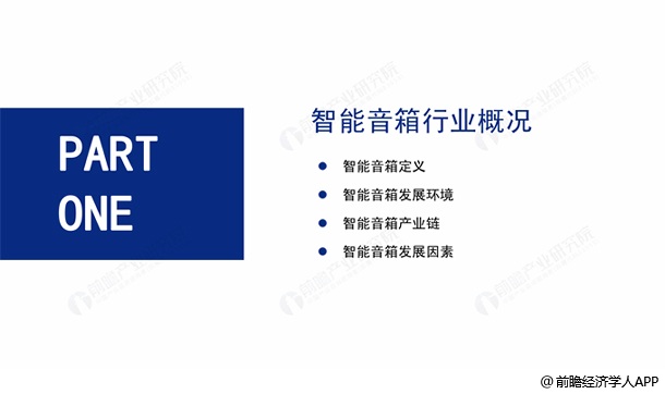 在“智能音箱行业概况”章节,报告从“智能音箱定义”“智能音箱发展环境”“智能音箱产业链”“智能音响发展因素”四个维度全面分析智能音箱行业。