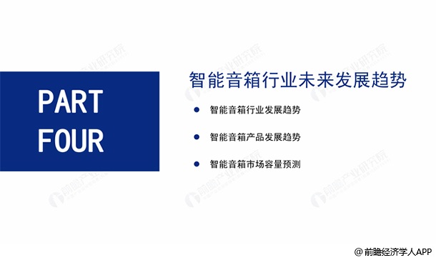 针对智能音箱行业的未来,《2018年智能音箱行业市场研究报告》也在第四章“智能音箱行业未来发展趋势”节做了深入分析,从“行业发展趋势”“产品发展趋势”和“市场容量预测”三个板块提供了前瞻性预测。