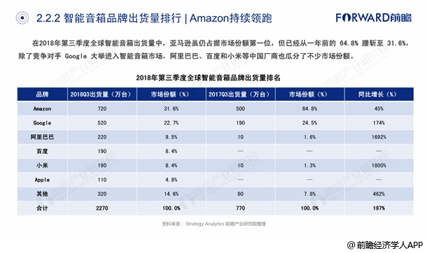 而亚马逊的先发优势也延续到了2018年,但竞争压力持续加大。据《2018年智能音箱行业市场研究报告》的统计数据,2018年第三季度全球智能音箱出货量排行中,亚马逊虽然仍占据市场份额第一位,但在多方围剿下,份额已从一年前的64.8%腰斩至31.6%,除去强势的谷歌,来自中国的阿里巴巴、百度以及小米,也瓜分了不少份额。