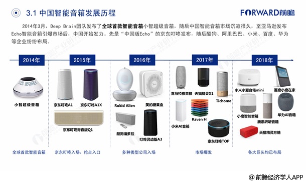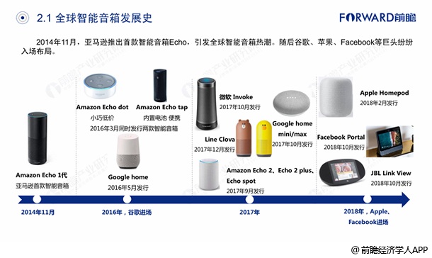 报告第二章节重点阐述“全球智能音箱行业发展”。在该章节,前瞻产业研究院回顾了全球智能音箱发展史,认为2014年11月亚马逊推出的智能音箱Echo,是全球智能音箱热潮的起源。