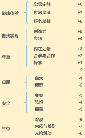 这一模型,将著名的马斯洛需求模型与大卫·霍金斯相近的能量层级模型,做了整合和对照,从组织和个体的需求动机角度,来看待能量高低(见下图)。