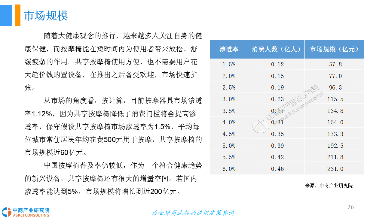 中国按摩椅普及率仍较低,作为一个符合健康趋势的新兴设备,共享按摩椅还有很大的增量空间。若国内渗透率能达到5%,市场规模将增长到近200亿元。