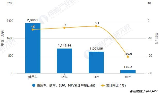 2018年1-12月中国乘用车、轿车、SUV、MPV产量统计及增长情况