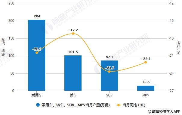 2018年下半年以来,中国车市开始进入下行通道,且持续低迷。据前瞻产业研究院发布的《中国汽车整车制造行业需求前景预测与投资战略规划分析报告》统计数据显示,2018年12月中国狭义乘用车(即乘用车,分轿车、SUV、MPV)产量为204.04万辆,环比下滑2.6%,同比下滑20.5%。累计方面,2018年1-12月累计产量为2308.90万辆,同比下滑5%。
