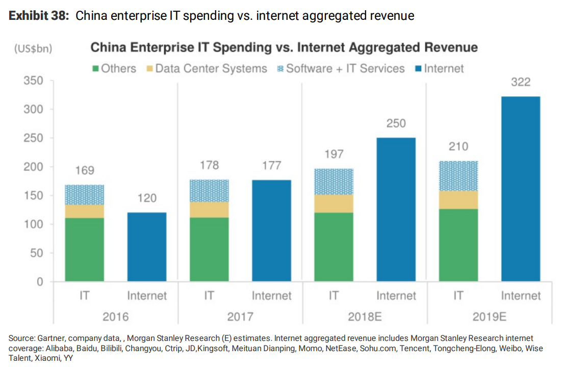 摩根士丹利指出,面向企业的领域还有大量增长空间:在企业的IT开支方面,相比美国,中国的软件和IT设备投资程度仍然较低。在政府的推动下,预计未来六年,对工业部门或是企业IT的投资将为BAT带来5-20%的增量利润。