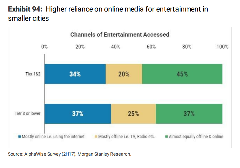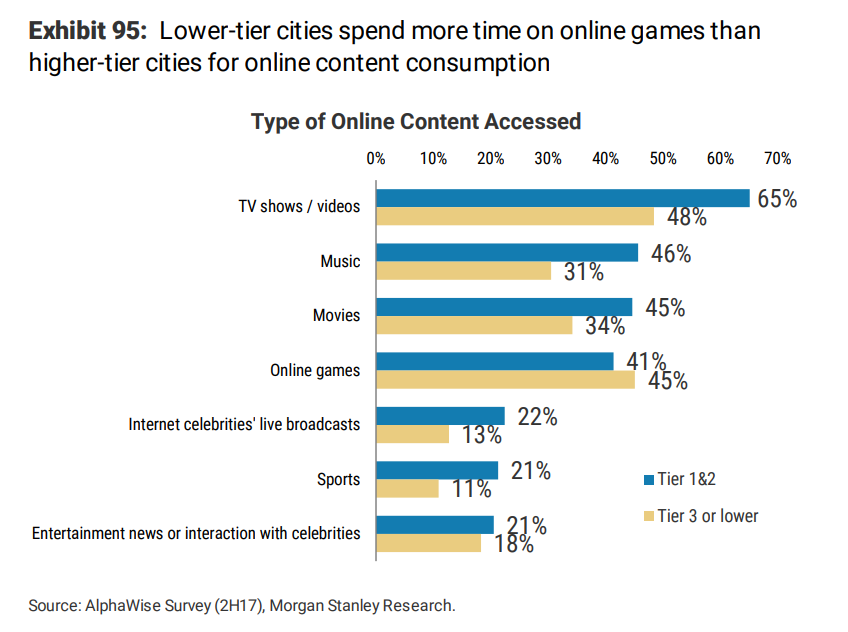 低线城市的家庭对二孩政策持更欢迎的态度,人口上升使得低线城市更具发展潜力。而摩根士丹利还提出了一个有趣的观点:相比于高线城市,低线城市线下的娱乐设施更少,他们在社交和游戏这种线上娱乐方面花的时间,对应地也就要更高。