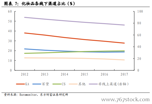 我国面膜行业增速快,5 年 CAGR 约 15.8%。从护肤市场的细分品类来看,面部护理份额较大,其中,面霜、抗衰以及面膜产品占比最高,三者合计占护肤市场 70%左右。从增速来看,面膜是近年来发展最快的面部护理品类,五年 CAGR 高于护肤行业 CAGR5.5 个百分点,从今日头条发布的 2016H-2017H 美妆⼈ 群阅读关注度亦可发现,关键词“面膜”位居首位。消费者对面膜的认知程度不断加深,消费习惯也在持续养成,我国的面膜总体消费在全球市场中占比已近 50%,与我们有相同文化基因的日本和韩国相加约占四分之一。据预测,我国面膜市场的高增速未来五年有望延续,面膜也是本土化妆品公司重点发力的方向。