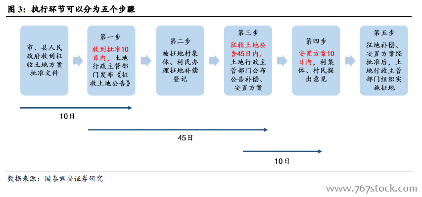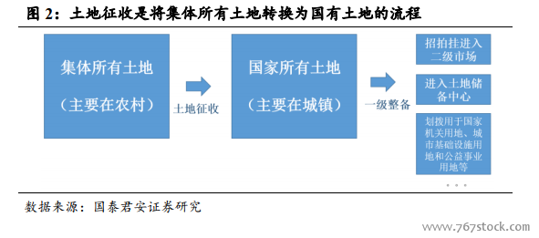 在我国,土地分为国家所有土地和集体所有土地,土地并没有私人所属权,农村土地征收是将集体所有土地转换为国有土地的流程。根据我国《土地管理法》规定:“城市市区的土地属于国家所有。农村和城市郊区的土地,除由法律规定属于国家所有的以外,属于农民集体所有;宅基地和自留地、自留山,属于农民集体所有”,因此我国土地分为两种所属权,国家所有与集体有所有,并没有存在私人所有土地。农村的集体用地经过征地手续后,可以转换为国家所有土地,并通过土地一级整备及招拍挂进入二级市场,或者直接通过划拨方式用于国家机关用地、城市基础设施用地等。