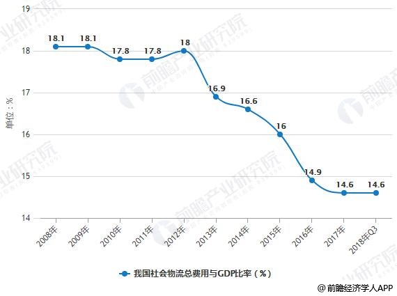 2008-2018年Q3我国社会物流总费用与GDP比率统计情况