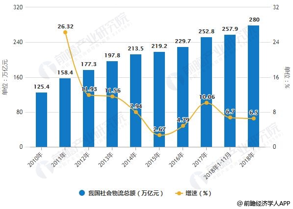 2010-2018年我国社会物流总额统计及增长情况预测