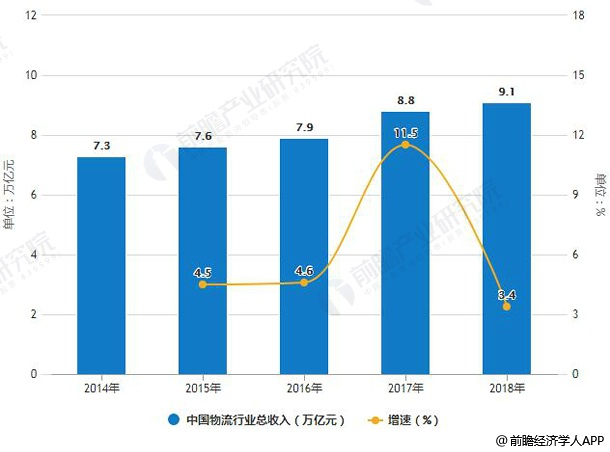 2014-2018年中国物流行业总收入统计及增长情况预测