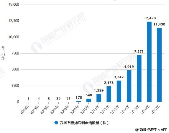 据前瞻产业研究院发布的《中国石墨烯行业战略规划和企业战略咨询报告》统计数据显示,通过对石墨烯中国专利、论文进行检索,共检索到石墨烯中国专利申请43988件,论文累计发表6万余篇,总体而言,我国石墨烯专利论文数量呈指数增长趋势。我国石墨烯专利的申请与受理始于本世纪初,从2009年开始,我国石墨烯专利申请数量一直处于快速增长态势。中国政府、科研机构以及相关企业近年来对石墨烯相关技术一直保持高度的重视,国内石墨烯研发的高潮持续不减。2016年石墨烯专利申请数量已达到12420件,2017年专利申请量略有减少为11430件。目前,石墨烯专利申请技术方向主要集中在:以石墨为原料制备石墨烯的技术及工艺;石墨烯在储能、涂料、传感器等领域的应用:CVD制备石墨烯及其转移技术