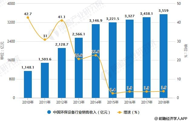 据前瞻产业研究院发布的《中国环保设备行业市场前瞻与投资战略规划分析报告》统计数据显示,2010年中国环保设备行业销售收入已达1148.1亿元,之后呈现出逐年扩张态势,2014年中国环保设备行业销售收入突破3000亿元。但2015年开始中国环保设备行业规模增速明显放缓。到了2017年中国环保设备行业销售收入达到3438.1亿元,同比增长3.3%。截止至2018年中国环保设备行业销售收入达到了3559亿元左右,同比增长了3.5%,延续了行业低速增长趋势。