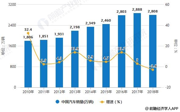 2010-2018年中国汽车销量统计及增长情况