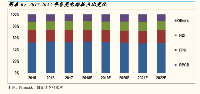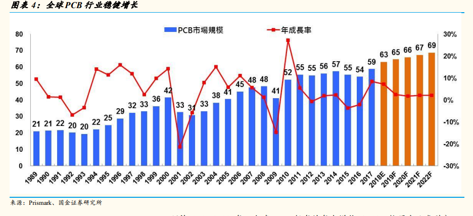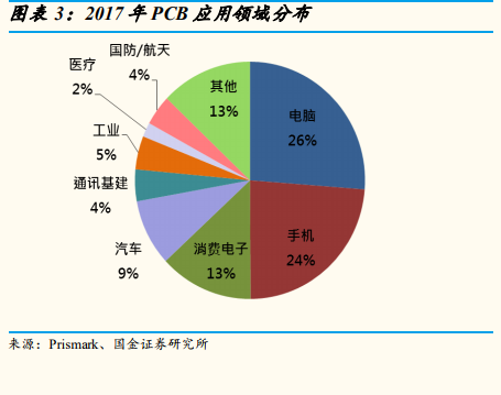 新兴产业需求保持快速增长。2017 年,PCB 第一大应用市场为计算机,占比 23.8%,第二大市场为手机,占比 23.7%,预计未来 3-5 年,通讯基站、汽车、消费电子将快速增长,2017~2022 年年均复合增速将分别达到 4.9%、4.8%、4.7%。
