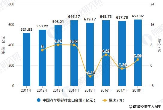 2010-2018年中国汽车零部件出口金额统计及增长情况预测