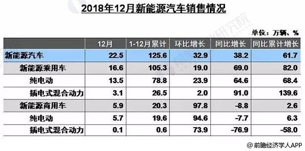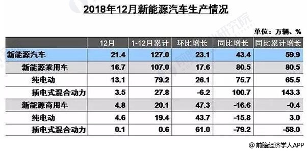 2018年,汽车产业受多方面因素影响出现市场下滑,但长期向好的发展前景没有变,尤其是新能源汽车产业发展仍然保持了良好势头。据前瞻产业研究院发布的《中国新能源汽车行业战略规划和企业战略咨询报告》统计数据显示,2018年12月,我国新能源汽车产销分别完成21.4万辆和22.5万辆,比上年同期分别增长43.4%和38.2%。累计方面,2018年1-12月,我国新能源汽车产销分别完成127万辆和125.6万辆,比上年同期分别增长59.9%和61.7%。