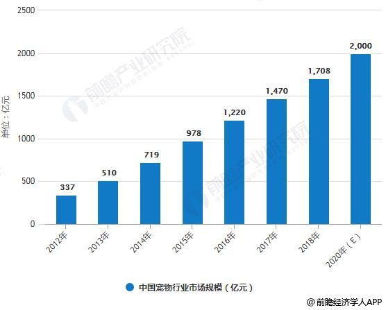 随着宠物市场诞生后人们饲养宠物观念的逐渐普及,中国宠物行业经过二十多年的发展已逐渐形成规模。2012-2017年我国宠物行业市场规模不断扩大。据前瞻产业研究院发布的《中国宠物行业市场前瞻与投资战略规划分析报告》统计数据显示,2012年中国宠物行业市场规模仅仅为337亿元。2016年中国宠物行业市场规模增长突破千亿元,到了2017年中国宠物行业市场规模达到1470亿元,同比增长20.5%。截止至2018年中国宠物行业市场规模达到了1708亿,增速高达27%。其中宠物狗市场规模1056亿元,宠物猫市场规模652亿元。前瞻产业研究院预测在2020年,中国宠物行业市场规模将达到2000亿元。
