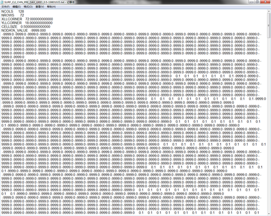 第六行"NODATA_value -9999.0"表示中国区域以外的值用-9999.0表示。