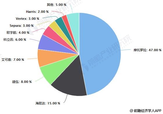 2018年全球专网通信市场需求强烈,但伴随着的市场竞争也逐渐加剧,技术领先同时拥有品牌及渠道优势的企业占据着行业大多数市场份额。在全球市场,摩托罗拉、海能达、健伍等前五家企业占据了80%以上的终端市场份额。根据IMS的数据显示,尽管最近几年全球市场份额有所下滑,摩托罗拉仍处于绝对领先地位,2018年市场占有率预计为47%。