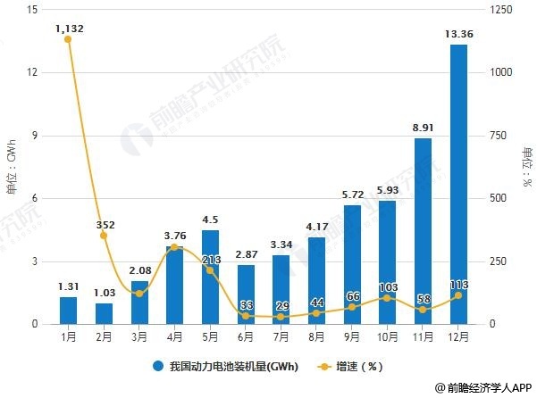 2018年1-12月我国动力电池装机量统计及增长情况