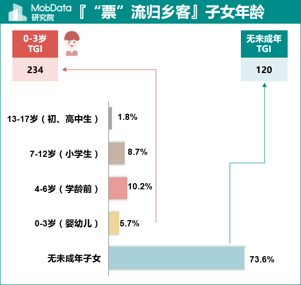 『“票”流归乡客』中已婚人士居多,占比63.7%;无未成年子女占73.6%,0-3岁子女占比5.7%,远高于平均水平。