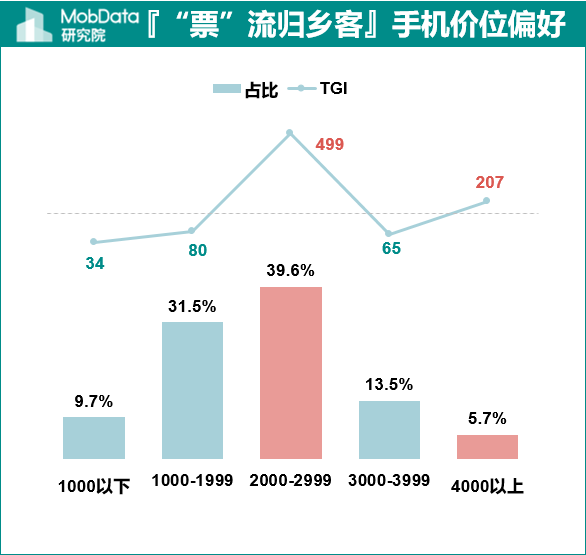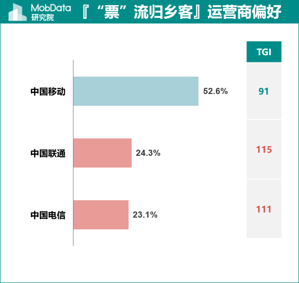 『“票”流归乡客』中安卓手机价位多集中在2000-2999元,占比39.6%,TGI高达499,远高于平均水平。『“票”流归乡客』大多已婚有家庭,考虑因素诸多,生活压力不小,与单身青年时期追求品牌和新鲜感不同,更加回归生活本身,在手机品牌和机型选择方面则更加务实。运营商中中国移动占比52.6%,联通、电信TGI相对较高,分别为115和111。