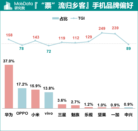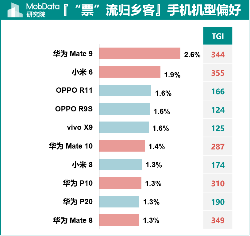 『“票”流归乡客』偏好华为、小米、坚果、一加等第二梯队手机品牌明显,高TGI机型如华为Mate9、华为Mate8、小米6等。