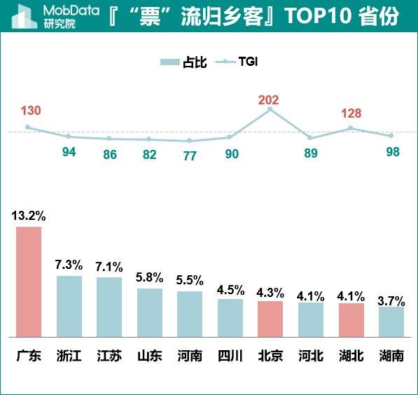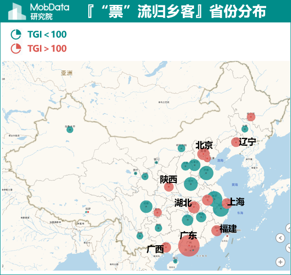 『“票”流归乡客』以广东、湖北、北京、上海为中心向周边辐射。其中广东、北京、湖北分布占比远高于整体人群。