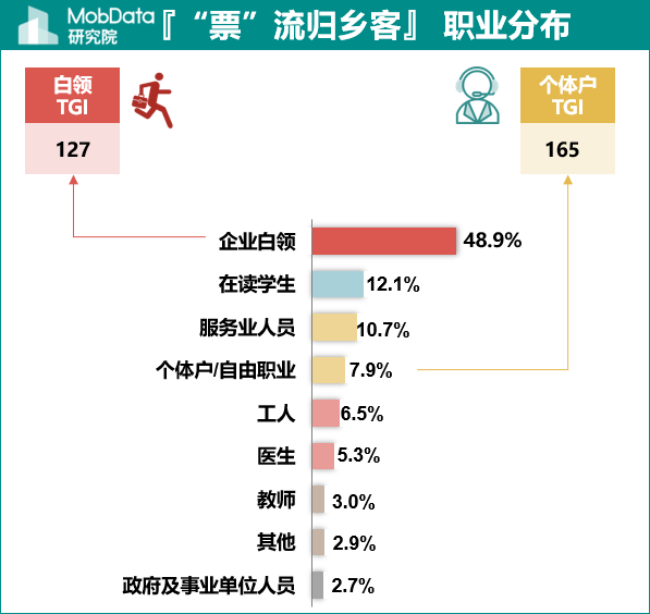 『“票”流归乡客』 中企业白领占48.9%,5-10K收入达44.4%,10-20K收入TGI高达166。