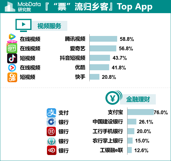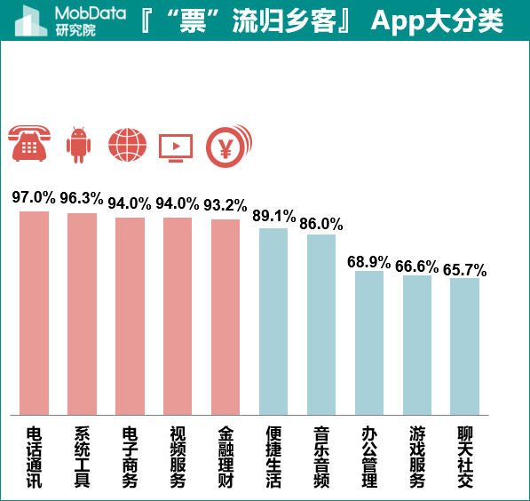 『“票”流归乡客』 对通讯、系统工具、购物、影音、金融理财App更为偏好,均达90%以上;与全体人群相比,『“票”流归乡客』中大多装有1款购票App。恋家、想家、念家是每个异乡人独具的情感,常回家看看、常联系亲友是异乡人不断的渴求。