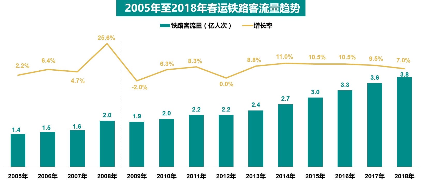 铁路客流量逐年增长。2008年8月1日,中国第一条具有完全自主知识产权权、时速350公里高速铁路通车运营,由此开启了中国高速铁路新时代,那年铁路客流量增长率高达25.6%,之后铁路客流量增长率放缓但仍保持增长趋势。